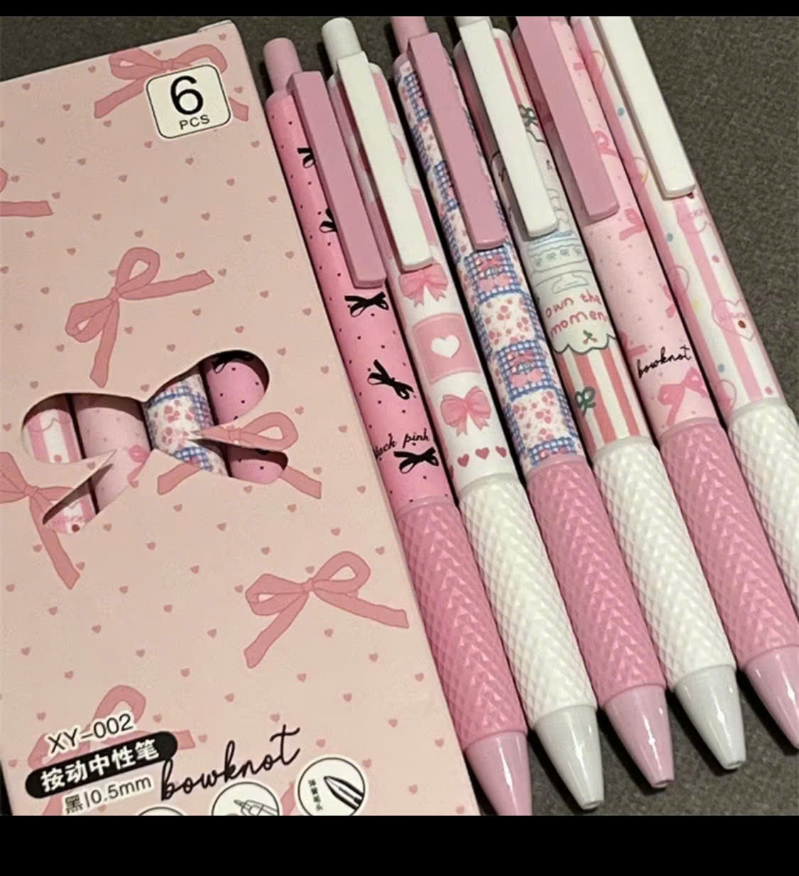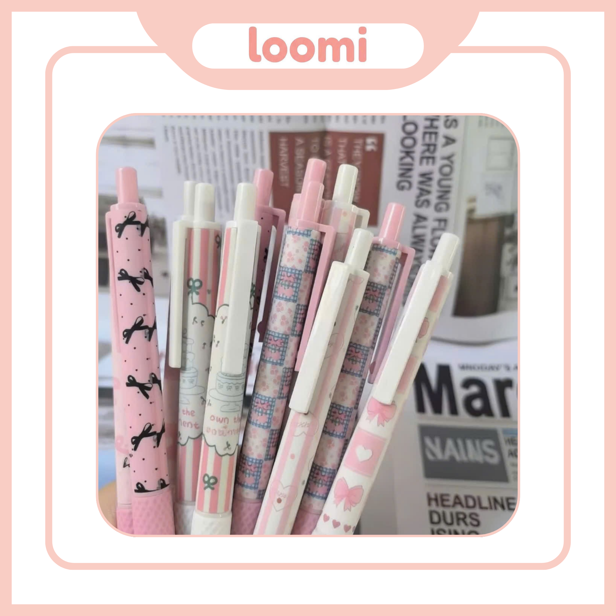 Sản phẩm gây ấn tượng mạnh ngay từ cái nhìn đầu tiên bởi sự đa dạng trong họa tiết. Mỗi chiếc bút trong bộ sưu tập là một diện mạo khác nhau: từ chấm bi đen tinh tế trên nền hồng, họa tiết kẻ sọc trẻ trung cho đến những hình vẽ bánh ngọt và nơ xinh xắn. Sự tỉ mỉ trong cách phối màu giúp chiếc bút trở nên nổi bật trên trang giấy và cực kỳ “ăn ảnh” khi bạn muốn chụp hình check-in góc học tập.